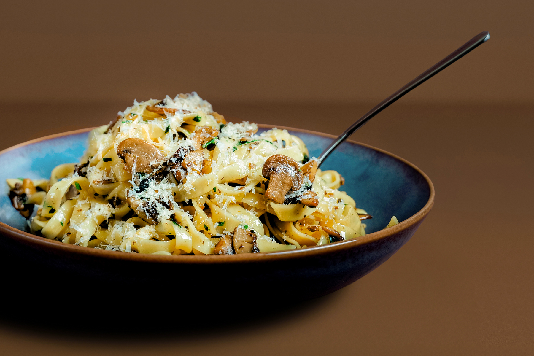Transfira o tagliatelle para a frigideira com o molho de cogumelos e adicione a água que reservou do cozimento da massa, para deixar o molho mais cremoso.
